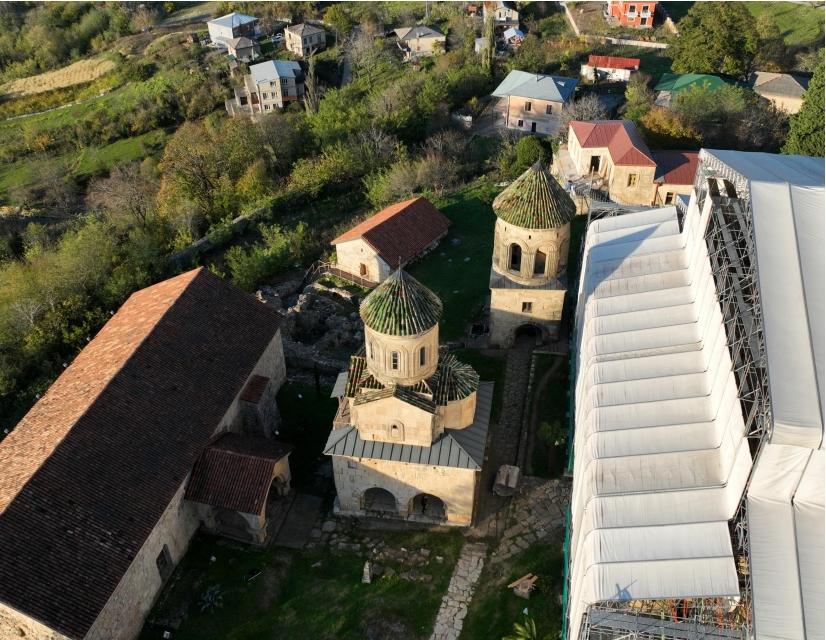 In accordance with the 6th recommendation of the of the report of the joint WHC/ICOMOS/ICCROM Advisory mission to Gelati in 2022, the use of Safe Scaffolding was constructed in the East wing, and specialists are allowed to examine the condition of the wall paintings and the mosaics of the apse of the sanctuary without hindrance.